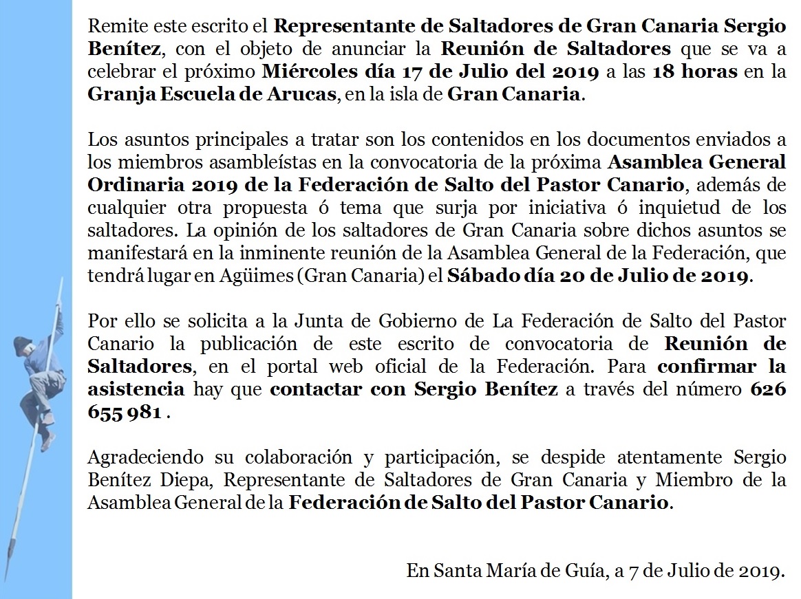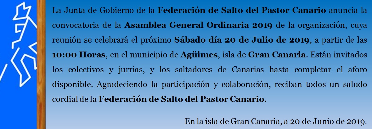 Asamblea General Ordinaria 2019 de la Federación de Salto del Pastor Canario – Junta de Gobierno de la FSPC – Agüimes – Gran Canaria – Julio de 2019.