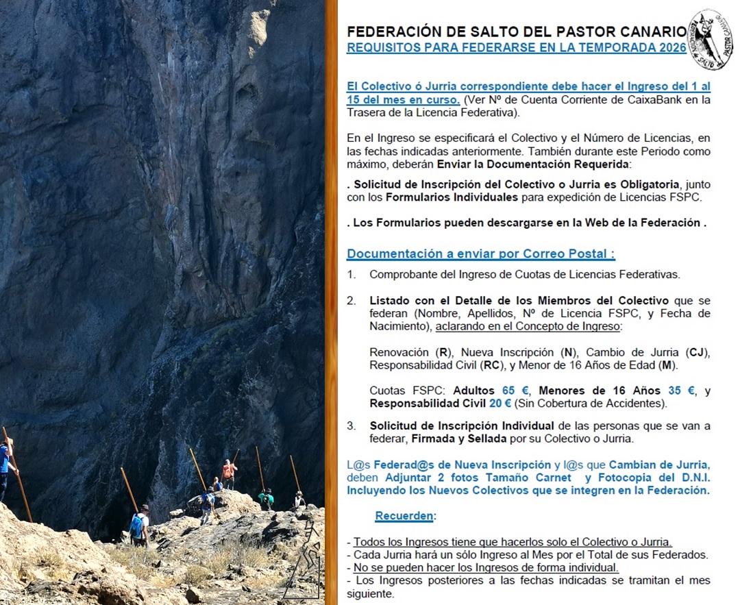 2026 - PROCEDIMIENTO Y REQUISITOS DE FORMALIZACIÓN DE LICENCIAS FEDERATIVAS FSPC (2026) : Protocolo interno de gestión establecido por la Junta de Gobierno de la Federación de Salto del Pastor Canario, en el que se determinan los Plazos, Cuotas, Contacto Postal, Documentos, y Requisitos de Inscripción que cada año los Colectivos y Jurrias, y los Saltadores de Canarias, deben tener en cuenta para Formalizar ó Renovar el Alta de la Licencia Federativa Oficial de la organización.